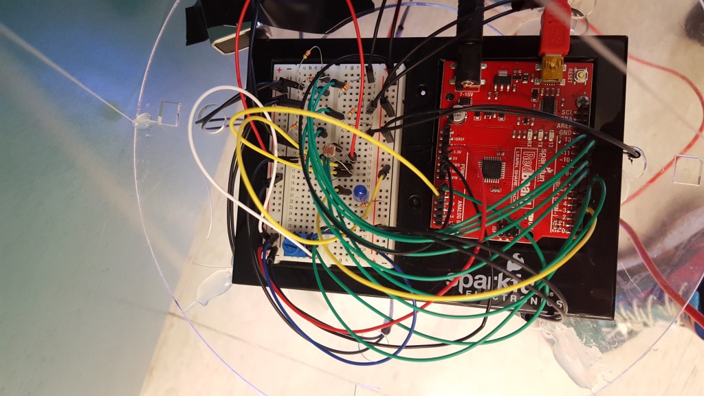 What is left to do is to fix the way everything is mounted on the base plate so it can all fit under the jello mold, attach extension wires to the LED and the photoresistor so they can sit higher up, and put some tissue paper on top of the jello mold to cover the electrical components.