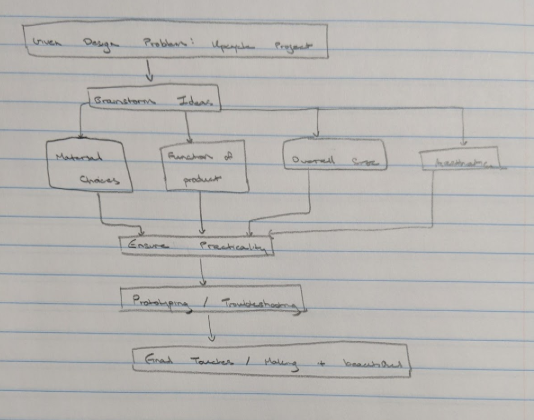The design process that I followed was pretty generic for this project. It began with me looking at the problem statement and then brainstorming ideas. This thinking process involved studying what type of materials to use, how large the object will be, what kind of aesthetic I wished to apply, and of the functionality of the project. Moving on, I began thinking about the practicality of the project. This was basically a sanity check to make sure what I was planning on making was not only possible but within my budget. Next, I moved on to the prototyping and troubleshooting phase where I began constructing the project and when certain problems arose I would find solutions to them on the spot. This was actually the most difficult part of the project because cutting the aluminum cans into a specific shape turned out to be much harder than I thought. Finally, the last step was to put on finishing touches and making the project look beautiful in general. The image below shows the complete flowchart that I used.