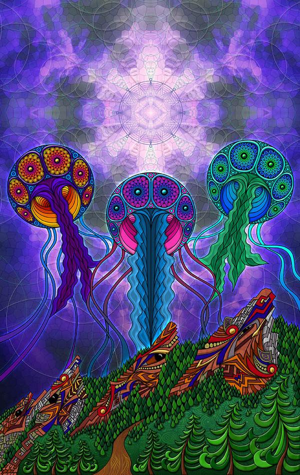 All of the artwork shown above is created by Phil lewis. He creates these pieces using pen and paper in combination with digital design. This aesthetic includes the raw nature of pen and ink as well as endless possiblities of a digital canvas. This aesthetic creates images that fell organic, but are also state of the art in terms of our time period with constantly increasing technology. The organic part comes from the influences of nature and the outdoors, while the technological part includes things that phil has created on his own using his imagination and technology. Throughout Phil’s life, he has made a great connection with nature and the outdoors. This has immensly inspired his artwork. In every one of his artworks you see things in nature such as the red rocks from a great concert venue in colorado, jellyfish animals, the flatirons here in Boulder, fox, trees, wind, mushrooms, owls, and even artwork representing vibration patterns of surfaces. Incorporated into all of those natural/organic things are repeating geometries created using Phils mind and digital design using a computer. This aesthetic is especially interesting to me becuase of the patterns inside of it. When you look at the picture you recognize some things that you have seen in this worls, but Phil also brings out the patterns in this world that you may not always see or may have never noticed. When you look around, it is not immediately obvious, but there are patterns with everything. These patterns may include the lines on trees leaves, the way the tree branches sway, the shapes of grass blades, the way hairs on animals stand and flow, the way light shines off particles in the sky, the vibrational modes of vibrating plates, and many more. These are patterns we may not necessarily notice when looking at the big picture of what is this world, but Phil really does a great job in bringing these out and making them noticable in his artwork. This all goes together to create his natural/digital aesthetic. Phil was born in Canada, then moved around till he ended up in Tahoe. He says that this mountanous area greatly influenced his art as well. Here he learned how to snowboard which also influenced his aesthetic in his art. What he got from learning how to snowbard was that he was coming up with it from scratch, being fluid and smooth, and creating his own style. All things that translated into his artwork, and it shows.