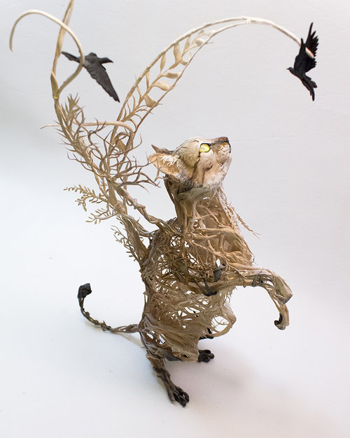 In terms of other aesthetics, there are a few that I could definitely lean into more that aren’t too much of a departure from the original concept. For instance, using a greater surreal aesthetic and move away from the contemporary aesthetic, like artist Jewett from above. For instance, the sculpture form could end up moving away from the use of chicken wire and instead be a more realistic material while departing entirely from the general form of an owl, and instead be more extravagant or mix the structure with that of differing animals. An example of this would be a sculpture like: