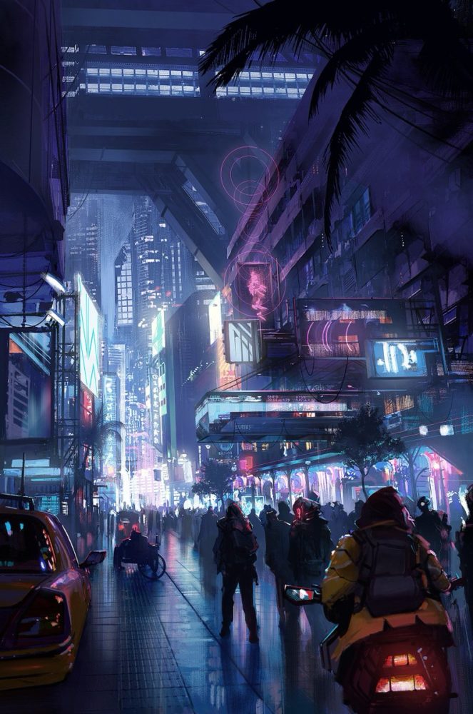 The cyberpunk aesthetic combines multiple visual aesthetics but generally portrays cities at night that are very high tech and futuristic. These elements are exaggerated with low key lighting that contrasts deep blacks with vibrant neon lights. Shades of purple, blue and pink are often key colors of this aesthetic. The cities depicted in this aesthetic are tightly packed with large skyscrapers and traffic caused by futuristic style vehicles. Often, a haze or smog is present in these images that makes the city feel large, very industrial and factory oriented. This aesthetic is generally characterized as “high tech, low life.” The cities are visually stunning and seemingly successful, however, the people that reside there are oppressed and assimilated by larger entities.