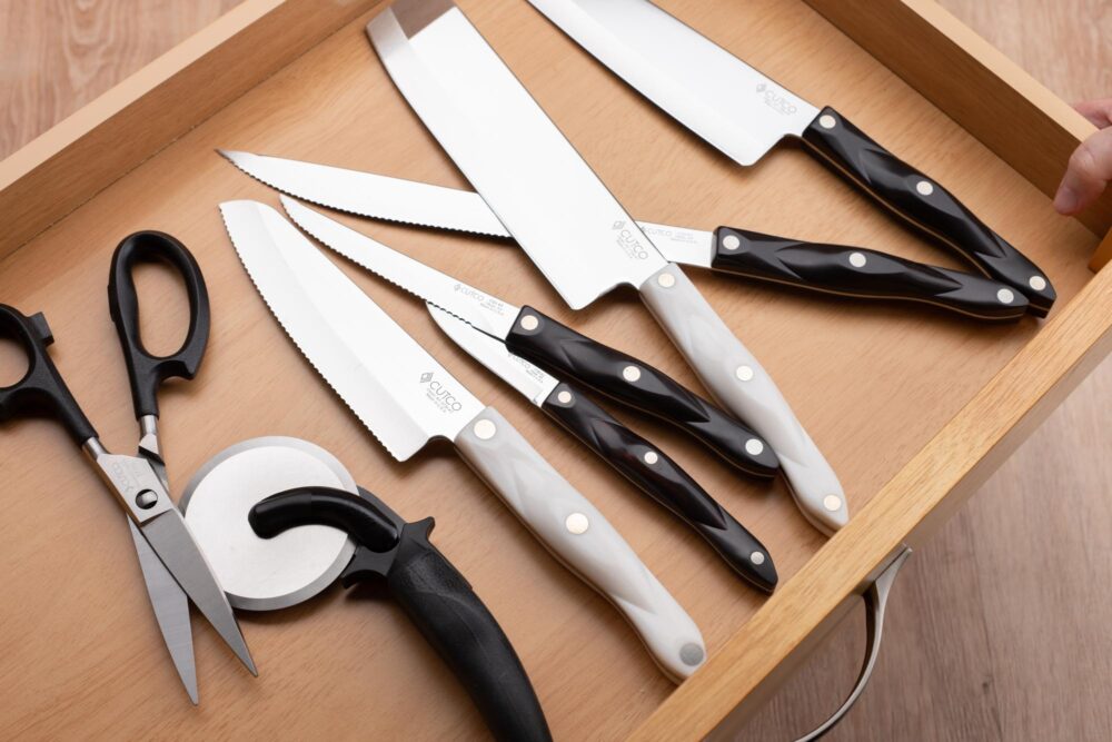 The knife storage solution in my apartment is currently precarious, to put things lightly. All of our knives are currently in a drawer in random orientations with knives of various lengths. They also happen to be somewhat near other cutlery, like forks and spoons, which means that it is a small miracle all of my roommates and I haven’t seriously cut ourselves. I’m honestly too embarrassed to take an actual picture of our knife/cutlery drawer, but it looks like a messier version of this picture: