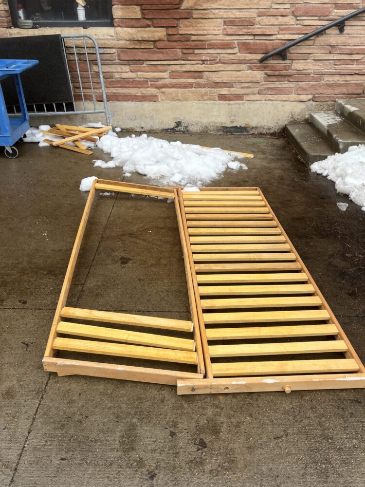 Progress: I found the perfect material to upcycle into the bulletin board! I was originally planning to use remnant wood in the MakerSpace leftover from random projects, but this week I came across an entire bed frame that being thrown away outside the Idea Forge. This will be great for my project.