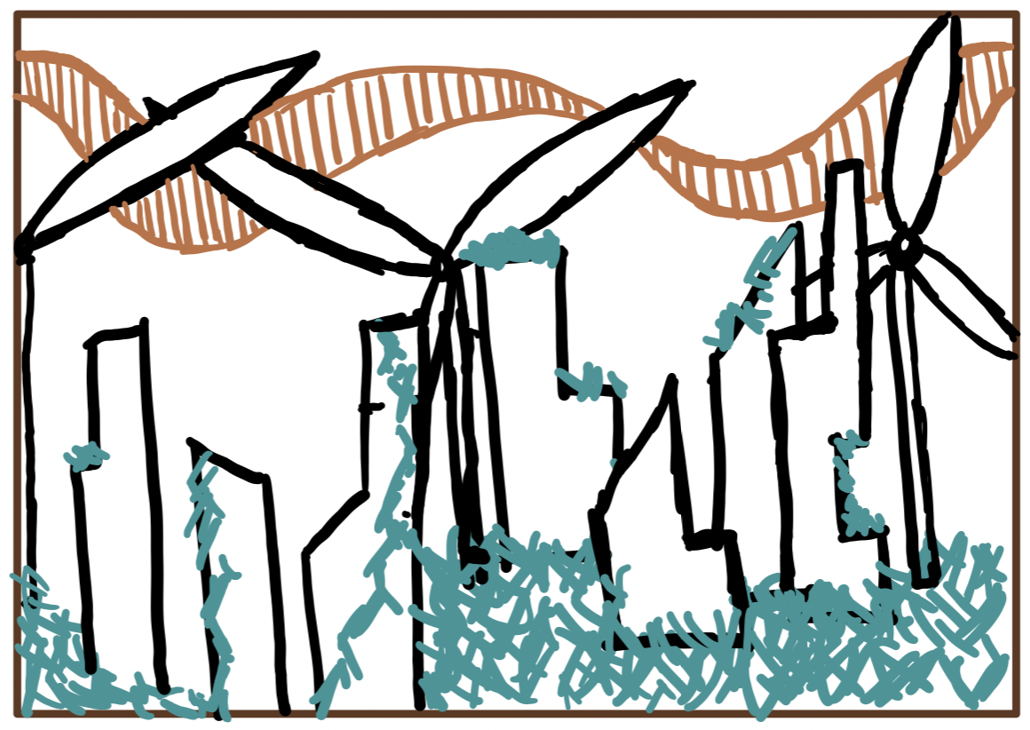 For my upcycling project, I decided to create an artwork display to fit into the environmental aesthetic. I wanted to create a modern industrial town that was running off energy produced by wind turbines. I also wanted the town to be filled with plants that were planted on the roofs and sides of the buildings. I will be making this by drawing the scene on cardboard and then using the corrugations of the cardboard to add texture and a sense of motion. I will then add the illusion of plants in the town and on the buildings by cutting out pieces of cyanotypes I previously made, rolling the pieces up into little beads, and placing them on the cardboard to add more dimension and color. I first drew out a sketch of what I wanted the art piece to look like when it is on the cardboard. This sketch can be seen below.