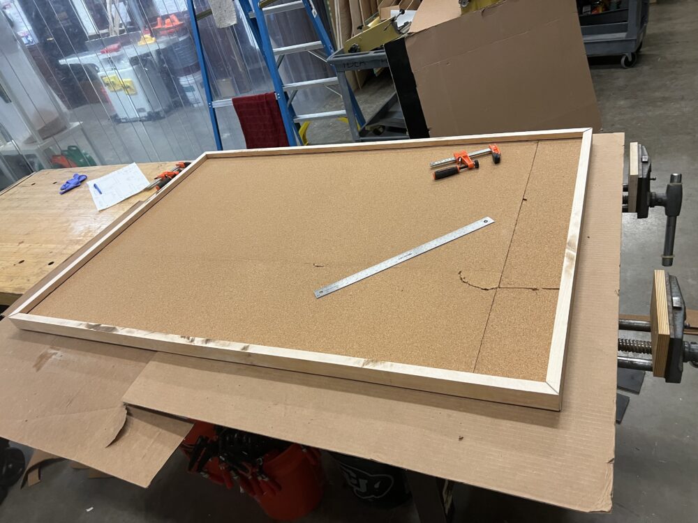 Context: I’ve owned a 50″ x 32″ poster map of the United States for probably 6 years now and have tried to display it in various ways that have been aesthetically ugly or annoying to hang up. I want to create the bulletin board frame so that the poster and cork can exist as one wall hanging that is more aesthetically pleasing art, easy to transport, and more robust for keeping pins in the poster.