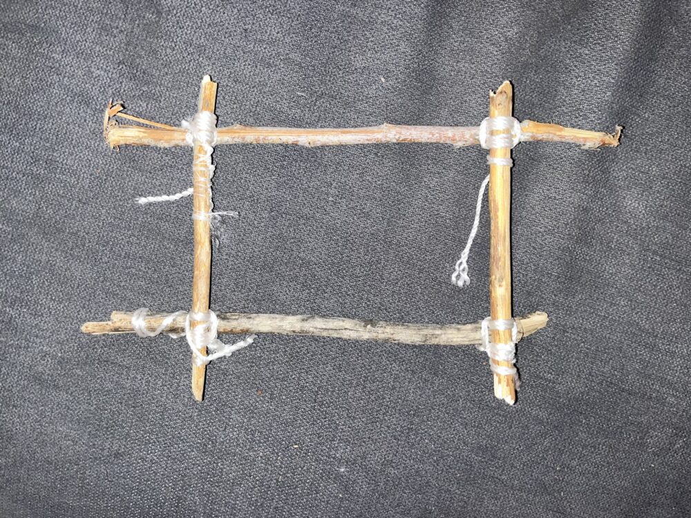 After these were assembled, I began tying four more short sticks between these side walls in order to make the main frame. This was a bit more challenging due to the fact that there were already many knoits on the frame, and routing the rope through all the sticks began to get challenging. I had to ensure that I was tying the knots tight without warping or even snapping the frame I already made. Eventually, I connected these four last sticks to all the necessary corners, and my frame was complete as below.