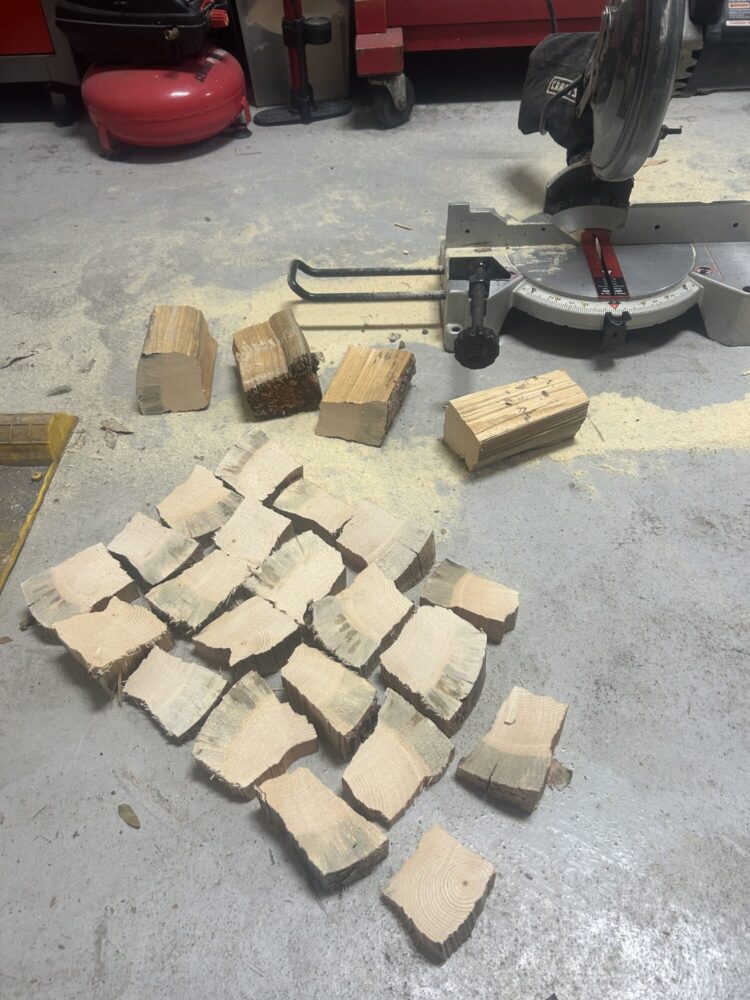 I repeated this process until all eight of the logs were used. Figure 3 is a progress picture of what these blocks looked like as they were initially cut. Many of them had frayed edges and splinters which made them difficult to hold.