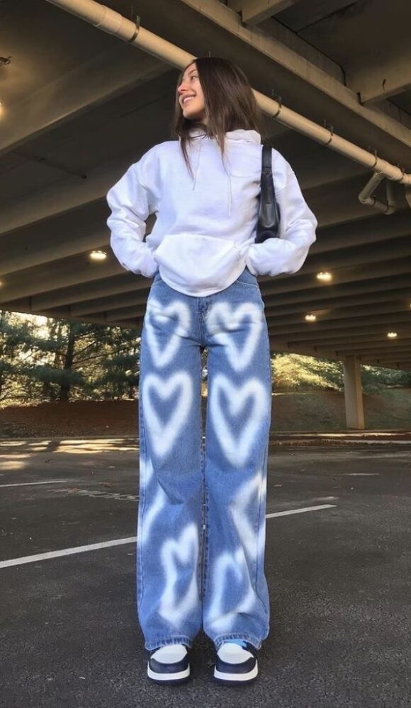 One thing that I was a little concerned about was whether I could really bleach the black jeans enough to obtain a white-ish tone. So I plan on testing out a small piece of the jeans to see what the final shade is. If I am not a big fan of the shade, then I planned on adding a bleached design on top to add to the cutesy vibe I am going for. I found a different YouTube tutorial from @trinity163 that showed how to bleach hearts onto pants and thought that could work well for the “light” side [2]. The short reel can be watched via the link referenced below, but a general idea of what pants look like while being bleached is shown on the left and what the finished product resembles is shown on the right.