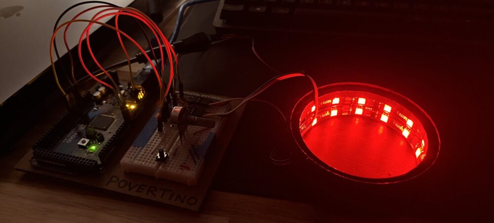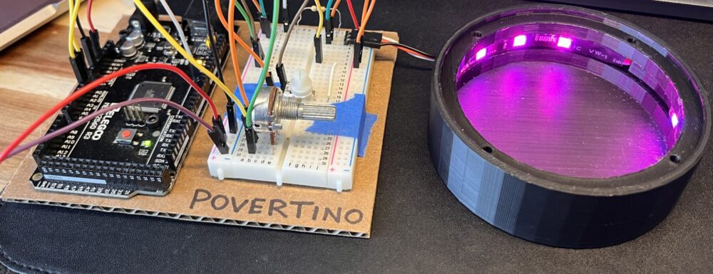After some attempts, I was able to use the FASTLED arduino library to get the led strip to work. After running some default commands, I was able to modify the code to proportionally map rgb output to potentiometer input. I then realized that this input could only control one parameter of the led strip at a time. Initially, I added a second and third potentiometer, each corresponding to a parameter (hue, saturation and brightness). Although this allowed for the most efficient adjustment, having three separate input knobs would not fit the streamlined space age aesthetic.