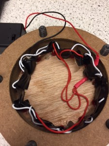 I chose to inset a ring of LED’s that I found in the ITLL. The only color options were red or yellow. Hoping to add some warmth, I chose red. I wired the LED’s together, soldering the joints, and connected them to a 9V battery that I found a handy case with a switch for. I had to put a resistor in the circuit to drop to voltage to an acceptable level for the LED’s.