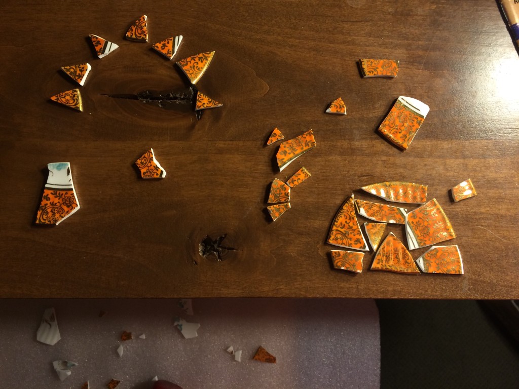 After arriving at this viable project idea, I then entered an iterative loop of trying to design the pattern for the mosaic, refining the broken china pieces, tacking them down with glue, and in some cases, hating the way that looked and revising the pattern, re-refining the piece, and re-tacking it down with glue.