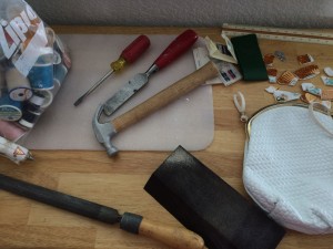 Notice that the brainstorming of project ideas and applications remained as the second step, but in the actual design process it was revisited again and again, leading to dead ends, inspiring further material gathering, and then back again to brainstorming ways to incorporate the new material. It was during this time that I was picking through a thrift store and came across a soft, vinyl-coated fabric purse, and decided to apply the mosaic to its front.