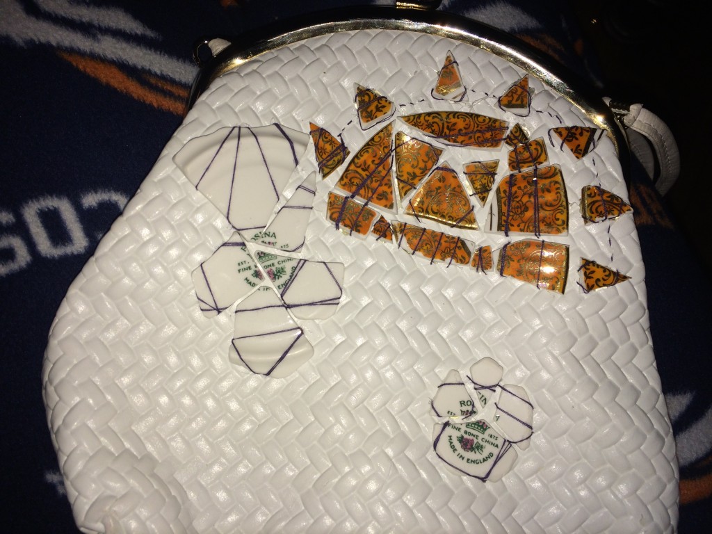Very interesting use of broken china and a handbag. It would be cool if the broken china was also on the other side of the bag. Nice work!