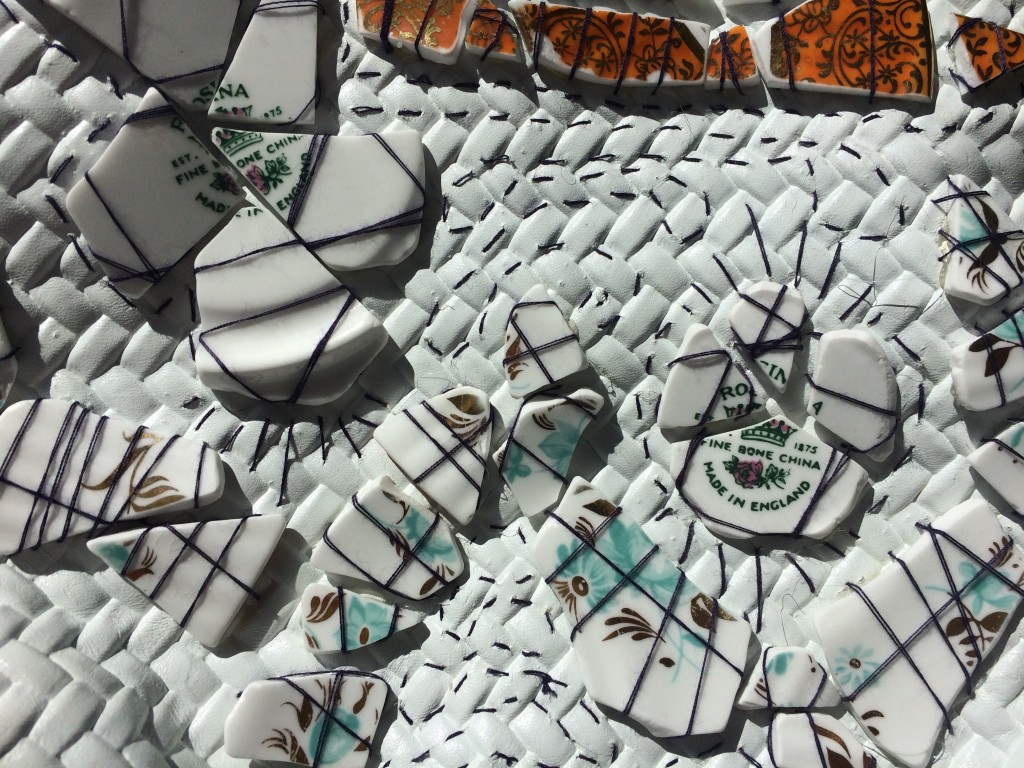 Great aesthetic. I have never seen ceramic mosaic on textiles. You took come nice of it photos on your blog. I see that you sanded down the sharp ends of the ceramic. Maybe have different color stitches. Otherwise this is a great save for a broken piece