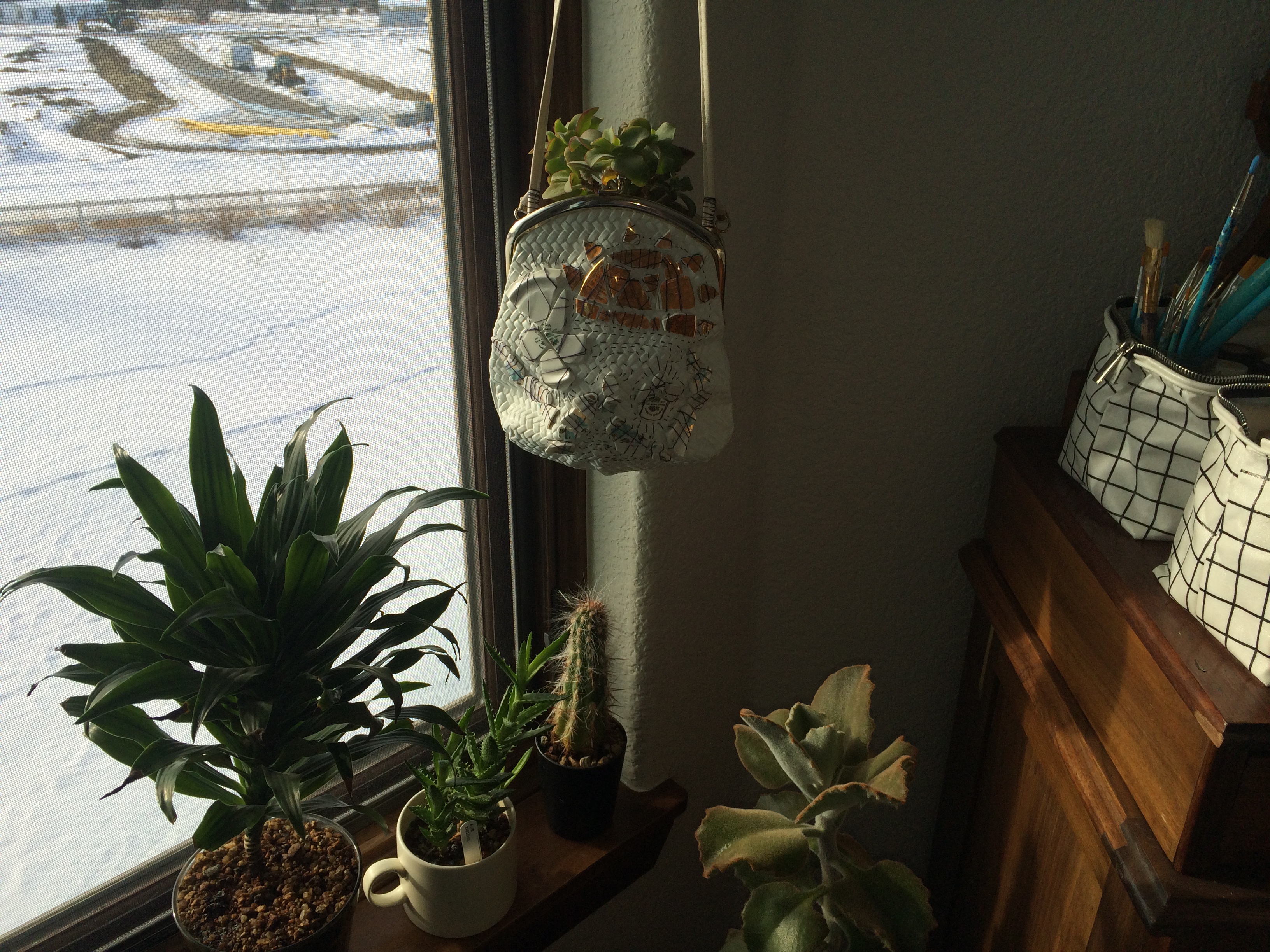 Creative project! I think there is a bit too much white space. The color of the ceramic and the bag blends in too much I think. Using different colors would offset the purse more. Cool idea using it as a plant holder.