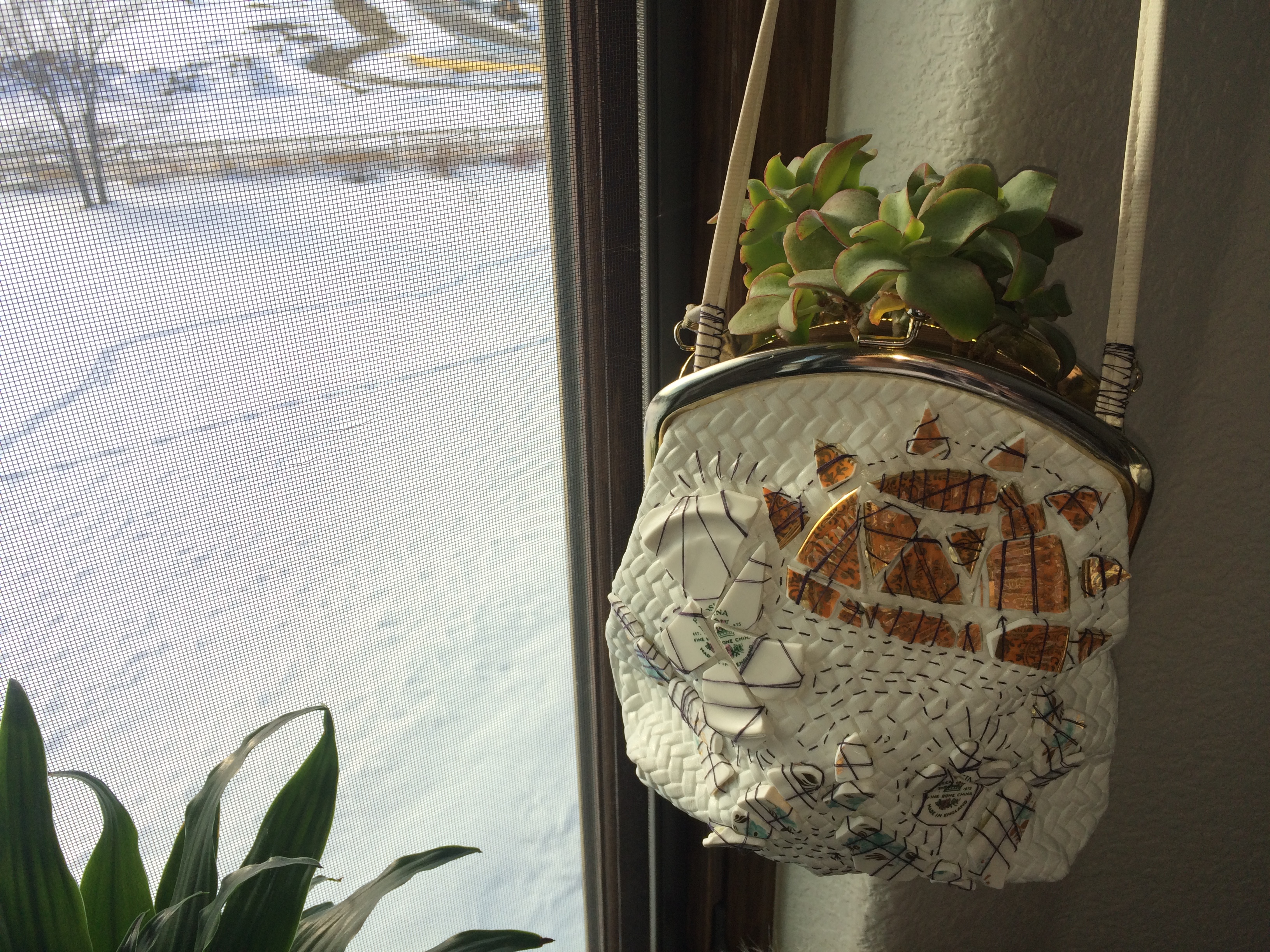 I’m glad you found a source of artistic inspiration for your mosaic! I remember you saying you wanted to make a mosaic but weren’t sure of the artistic direction. I really like the addition of the stitching and how you are using the purse as a hanging plant holder. Overall really cool project!