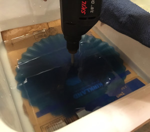 After purchasing a few supplies at Home Depot – diamond drill bit for ceramics and glass, eye bolt to attach the glass to the rod stem, and washers to place between the plates – the real fun began. To drill holes in the glass I filled my kitchen sink with enough water to submerge a single dish, then I placed large pieces of torn up cardboard in the bottom to cushion the plate and act as a backstop for the drill. Using the diamond drill bit I slowly and gently drilled a hole through the center of each of the dishes. Patience was important in this step. Luckily, my concerns about shattering the glass did not come to fruition!