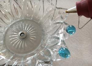 I then used a hot glue gun to attach colored beads to one of the dishes. Admittedly, the hot glue will not be as durable as silicone adhesive but that takes a long time to dry and I was afraid the beads would not stay in place. Before putting the flower outside in the elements I will likely add the silicone around the beads to help them last a bit longer.
