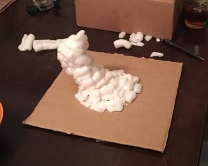 I began by forming the neck portion, and once it was about 3-4 inches in diameter I fastened it to a cardboard base (turns out that the packing peanuts stick to cardboard too!). Piece by piece, I added bulk to fill in a neck shape and begin to form its head. This is where the testing/evaluation phase came in, as I constantly needed to look at how the model was coming together, and whether it looked like my goal. This helped me tweak the angle of the neck and bulk up the model appropriately, which is where I left my model overnight (below, right).