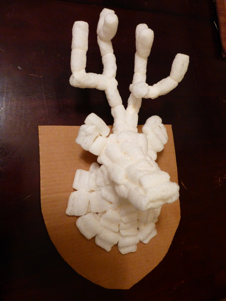 The ears I made from a few packing peanuts fastened together in a flat shape, which I then very carefully attached to the top of the head. These were pretty fragile for a few hours until it dried. The antlers I created by gluing peanuts on-end to make several short segments, which I then glued together and finally onto the top of the head between the ears. These were nerve-wracking because they didn’t dry very quick, and would flex at the bond areas. To keep them from collapsing or sagging overnight while they dried, I made supports (out of packing peanuts) to hold them up as the head was lying on the table.