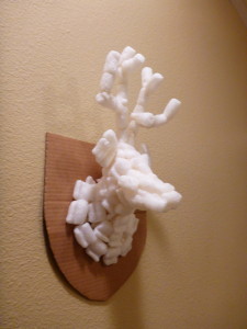 Nevertheless I began experimenting with connecting pieces together and ended up making a jagged-y looking stick of packing peanuts. Having a bit of an overactive imagination, this piece reminded me of an antler of some sort. This is where the idea of making a mounted deer head trophy came into play – it would be tough enough to construct, with suspended antlers and nose, yet would be instantly recognizable. I did try to develop some other ideas, but this one stuck like a wet packing peanut (sorry).