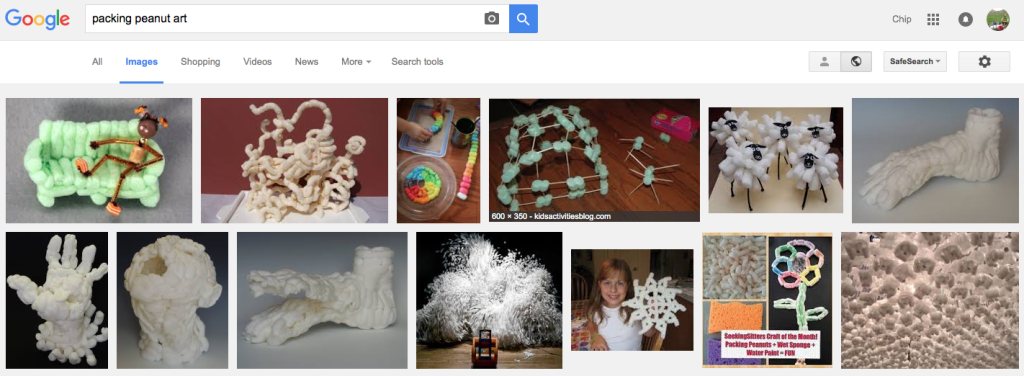 Originally, I wanted to build something stupidly huge with the packing peanuts, to prove that with the right ingenuity and perseverance, ginormous structures can be made out of small pieces (a la toothpick towers or card houses). Looking at the number of packing peanuts that I actually had, however, helped me realize that I didn’t really have the ability to make something all that tall. When I turned to the internet for inspiration, I was grossly unimpressed: