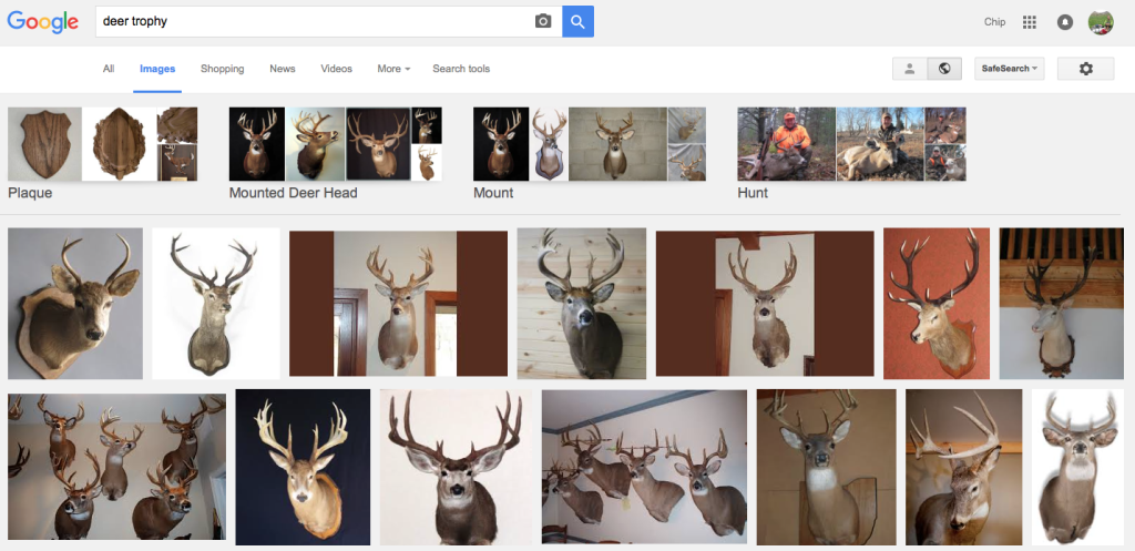 Upon settling on a mounted deer head, I looked into if/why it would fit into some aesthetic. I determined that mounted animals in general have their own aesthetic, as they are an icon of certain ways of life and regions of the country. If you were asked to think of a mounted animal head, I imagine that most people would picture the elk or deer head (with large antlers) hanging in the lodge at your favorite ski resort or your uncle’s cool but kind of creepy cabin. It is probably showcased on a wooden plaque shaped sort of like a shield, and the creature’s head is at some characteristic angle, cut off at the neck. The fact that there exists such a unanimous image of these trophies convinced me that this project would certainly be exploring an aesthetic, if not poking a bit of fun at it.