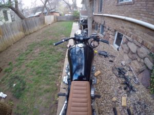 Next was to strip the paint off the tank, and start working the seat. The paint took a few hours. Thanks to some airplane paint stripper from McGukins I was able to peel most of the paint off the tank after two or three coats. The rest was removed by hand through meticulous scrapping with a sharp edge. After stripping the tank down to bare metal I turned my focus towards perhaps the most important look of a cafe racer: the seat. I first had to hand saw the back of the frame off using a hacksaw. This helped give the bike a smaller, and lighter feel along with provided the right structure for a custom seat. I initially thought of making my own seat from scrap but after some research, I found it was cheaper to just buy one already made online. I was able to get a seat from Dime City Cycles for about $100. The flat tan leather seat gives the bike an excellent look while the upkick at the ends helps frame the tail and blend the rider into the natural shape of the bike. The cafe style comes from the straight and flat look of the bike. The seat helped achieve this look but due to a larger front wheel than the rear, I decided to drop the front forks about an inch. This helped level off the entire bike. I plan purchase a new set of equally sized wheels this summer once I have a job to afford them.