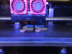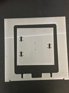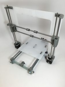 I did have a hand in material and component selection for this project. For one, I could choose the color of my 3D printed parts based on the colors I had available to me. I went with gray for most of the parts I printed, because I think it is very neutral and doesn’t call much attention to all of the components. Additionally, I needed to choose what I would make the frame of the printer with. Most Prusa i3’s are made with either a aluminum frame (~.25″ thick, as seen in the image above with a purple frame) or a laser-cut wooden box frame (the other image above). I prefer the look of the flat sheet frame, but didn’t want to buy a large piece of aluminum (~$50). My answer was nearly found when I got a piece of frosted white acrylic from the now-eliminated scrap pile at McGuckins for $3. I therefore planned to make both the frame and the build plate structure (not the build plate itself, which is made of glass) from this piece.