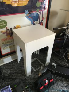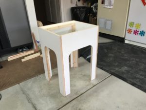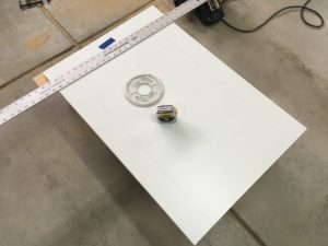 The final aspect of the base was the plate which the printer actually sits on. Also made of 3/4″ melamine sheet, it slips inside of the four side panels, supported by horizontal 2×2 boards glued into place. It is not fastened to the stand, so that I can remove the entire printer assembly (and its baseplate) if I want to work on it someplace else while not on the entire stand. This also allows me to secure the power supply unit (PSU), controller, and excess harnessing underneath the panel and everything can travel as one unit. I haven’t yet mounted these components to the underside of the panel, but when I do I will also attach four mini “legs” (also made of 2×2 board) to the underside so that the assembly can sit on these legs when not installed in the stand itself (and not sit on the electrical components themselves).