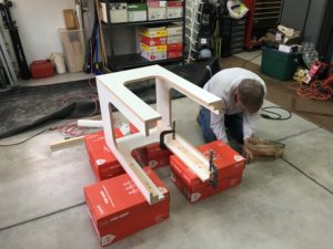 I worked on both the stand and printer in parallel, but I’ll discuss the stand first. Right away, I decided to postpone making a full enclosure for the printer (as I originally had sketched) and focus on the base, in the interest of time. The base is made of 3/4″ melamine panels (like are used to make shelves), with lengths of 2×2 board supporting each corner. I cut the panels using a circular skilsaw for the long cuts and a jigsaw for the fillets. It was somewhat of a challenge to bolt everything together, as I wanted to maintain the finish on all outside surfaces (to achieve a clean and smooth appearance for aesthetic purposes). Thus, I actually grinded down bolts to a length that wouldn’t protrude through the panel, and bolted everything together from the inside.