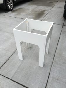 Right off of the bat, I knew I wanted to hide my harnessing, electronics, and filament better than this unit does, and put it in/on some sort of enclosure or stand. I didn’t have a free end table or workbench to put the printer on once complete, so I decided on building a dedicated stand, which is where I began to really think about aesthetics. Modern living rooms follow a bunch of different styles and aesthetics, so my project didn’t necessarily need to fit perfectly within any one particular style. However, I think that a 3D printer is a symbol of the future (and the idea that someday maybe every home will have one), and I wanted to represent that through the aesthetic of the printer and stand. After sketching a few different ideas, I came up with a shape that I liked – it looked modern and elegant, while providing a challenge to actually build. The stand would be white with four legs, each having large filleted internal corners. The printer itself would be white and neutral colors, so it could fit in any color scheme of living room.