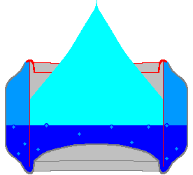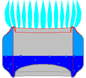 The general concept of how this style of stove works is illustrated well by these two images. The dark blue symbolizes the liquid denatured alcohol which is poured into the center chamber of the stove. Once the stove is lit (lightest blue symbolizing flame), the heat begins vaporizing the alcohol which pressurizes inside an interior chamber, shown as the lighter blue. The pressurized alcohol vapor exits the stove at the top through jet holes and is ignited by the central flame.