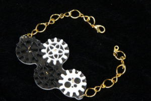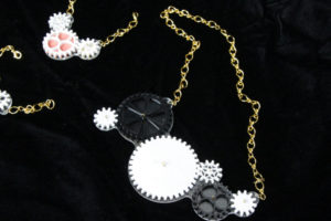 I had the pleasure of creating jewelry pieces for special occasions and daily wear. These pieces are intended to be statement pieces, both necklaces and bracelets. They are composed of gears that turn and interface with each other.