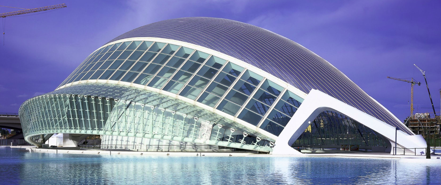 Calatravas work has followed a similar pattern as it has progressed forward. Some of his more recent designs feature a ribcage like features which create a large auditorium within for the users. The design here again uses white concrete as the support structure of the and to provide a smooth flowing aesthetic which seems to just rise out of the ground. This is one design of a large site with many more Calatrava buildings on it. the below picture shows more of the same building as well as some of the other Calatrava features in the same area of Valencia. the other buildings also follow and extremely similar characteristic to some of his other works.