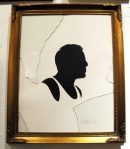 My personal favorite piece from that exhibit was the depiction of Bruce Willis from Die Hard. Each work of this exhibit was mounted on a simple white wall, framed and glassed. This entry, however, had the glass broken and pieces on the floor. Another instance of Olly’s love for double imagery, fans of the film may recall the chilling Die Hard scene in which Willis scrambles across the floor under gunfire, bleeding profusely from unavoidable shattered glass. In this instance the dual-image comes not from the picture or its emotional effect; the very presentation of the physical artwork itself refers to a scene that begins to play in our mind, sending shivers down the observer’s spine at the thought of having to sprint over a veritable carpet of glass shards.