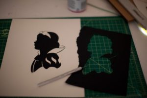 A particularly unique exhibit of Moss’s work featured hand-cut paper silhouettes of pop-culture characters, from Super Mario to Saved By The Bell. One of the most striking images in the gallery was Heath Ledger’s Joker from The Dark Knight, well regarded as one of the most haunting and memorable portrayals of a villainous character in film. Of over 200 finely-crafted silhouettes, this was the only piece to contain a color other than black and white… Olly added a slash of red to the Joker’s face, the iconic “smile” that asks of us, why so serious? He could have left that part out. The image is entirely recognizable without that bit of color; Olly’s ability to convey identity with outlines and B/W detail is unquestioned. But he broke the style of the exhibit, created an exception in this aesthetic, almost suggesting that the ideal itself had been scarred, had been damaged. Or perhaps to speak to the tragedy of Ledger’s death following this role, that this was the only subject who had been killed by the character, the image, he took on. As observers, it is up to us.
