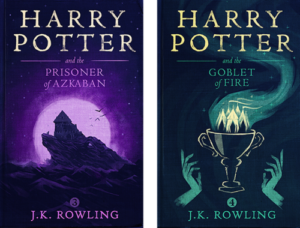 Beyond the immediately-noticeable single-hue or single-gradient coloration of these paintings, Olly has taken known imagery and iconography and presented it in a unique fashion. The key aesthetic here could be described as a high-contrast double-image… in every Harry Potter cover there is an immediate interpretation of the image, such as a book or a bird, but in moments the second image becomes apparent, like a wizard’s spell or the towers of a castle. This double-image style connects multiple subjects and often offers an easily-accessible hidden meaning: an outside joke, if you will. It doesn’t hide from the audience, but still provides a moment of excitement and appreciation when noticed. This is on top of the skilled artistic nature of the works, which is not to be ignored. Olly’s command of physical, digital, and mixed media color and contrast is superb, showing itself in a wide range of pop-cult minimalist pieces. His film posters (both commissioned and for personal enjoyment) for example are typically a combination of Photoshop vectors, watercolor, and oils, blended digitally with text to achieve the final product. Below are some notable examples following his single-gradient, double-image style.