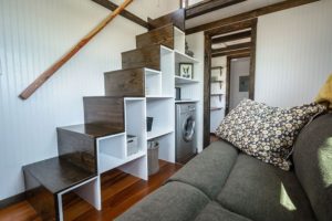 Most tiny homes are less than 300 square feet, therefore thoughtful and innovative use of space is important. The interior of tiny homes are designed to be efficient: many traditional elements of the home are redesigned to incorporate shelves and storage space. For example, the stairs in the image below house picture frames, baskets, and a washing machine.