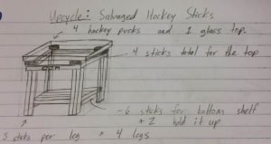 Alex, this is a great idea! I love the concept of using broken hockey sticks into making furniture because not only are you creating something of value out of them, they add character to the final product. Also considering the fact that hockey sticks cost hundreds of dollars, the coffee table will be far more valuable than the retail equivalent. Like we discussed, if you can put a glass cover on top, it can add to the usability. Also if you double layer the glass, you can put memorabilia in the middle layer, further adding to the character. I look forward to seeing the final product!