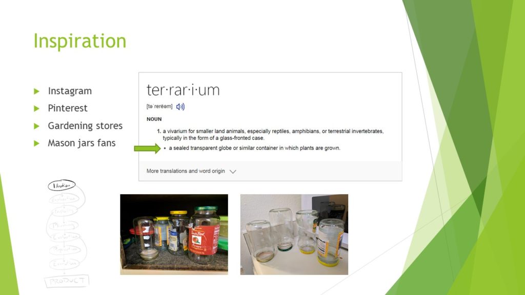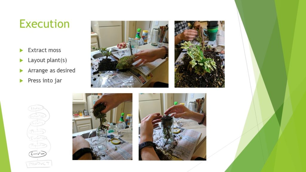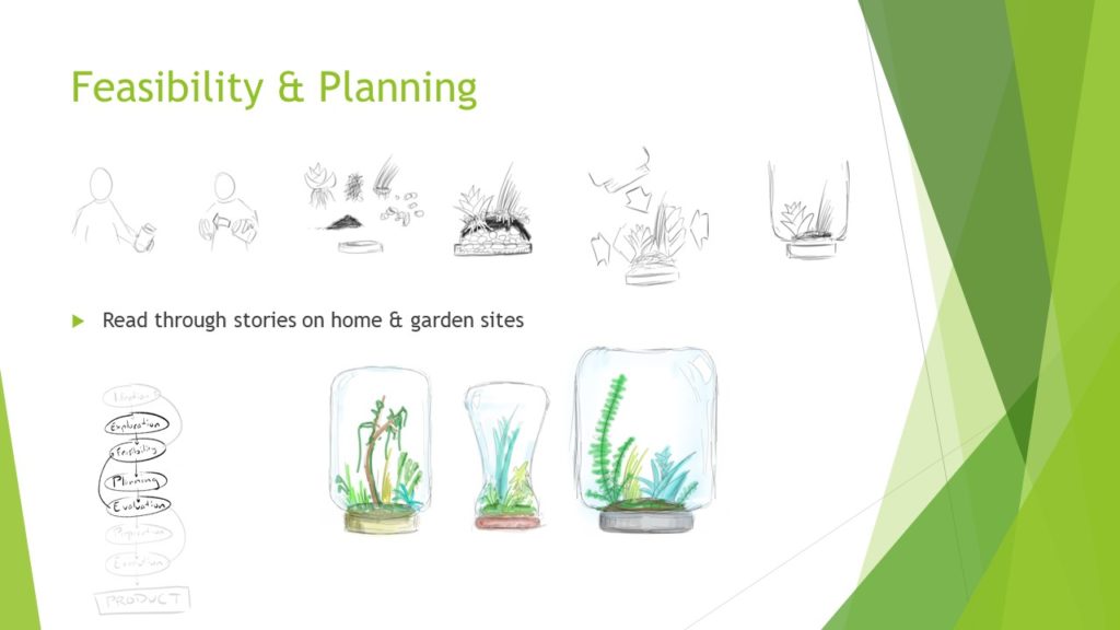 Feasibility was the critique stage of Exploration, where I reviewed what I had learned. Aluminum sheet modeling was discarded at this stage because of the difficulty of cutting the aluminum by hand (accurately) and the cost and design effort required to use a laser or water cutter. Terrariums passed this stage because of the accessibility of the materials and stories of similar projects online.