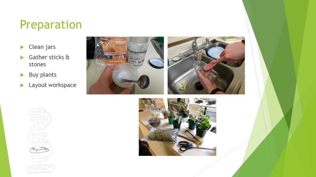 Preparation was the stage of gathering scrap ingredients (dirt, rocks, sticks), discussing with the experts at Sturtz & Copeland in Boulder, buying anything living (so, all the plants and moss), and setting up my workspace. I also had to make my own “Goo Gone” because I got home without any and the jars had sticky ick on them from the adhesive labels. Who knew baking soda and coconut oil was all you needed! Anyway, at the end of this stage I was all set to create.