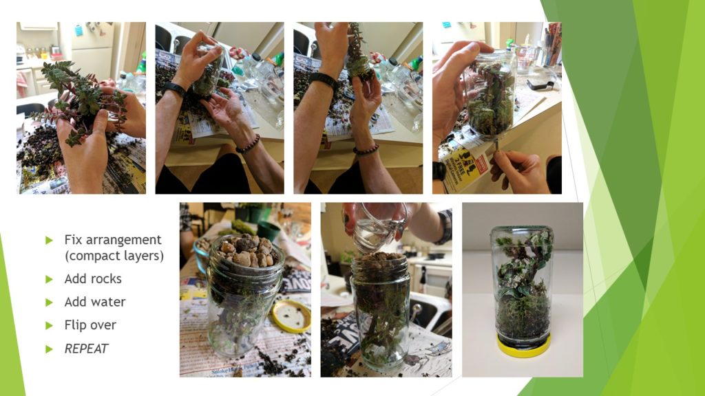 I was right. This was a simple terrarium to create. I arranged the pieces how I wanted, pressed the layers of moss and soil close together (that’s the only way the moss will survive), and lowered it into the jar upside-down. Then there’s the layer of rocks for drainage, and finally about a shot-glass of water (not too much so that the roots don’t drown). Everything went smoothly and I was pretty excited! You can see the first one in the slide below.