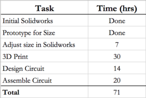 Given this timeline, I know I have 71 hours worth of work left do to. The goal is to finish resizing this week and start 3D printing the beginning of next week. Knowing spots fill up, it may take longer to 3D print than expected so I am going to get on the solidworks as soon as possible.