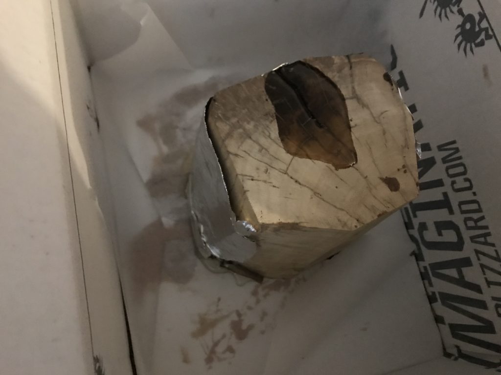 Finally, I found the time to work on the wood in the ITLL’s wood shop space they have in the basement. When I first brought the piece of wood in they thought that the wood was going to be to damaged and cracked to be a viable piece to work with, which is fair but being an upcycle project I wanted to work with wood that would otherwise end up thrown away, but they decided to at least trim the wood down to see how the internal material looked and using a band saw began to trim it down to size revealing that the wood itself was nicely dried and besides the big crack that propagated through most of the wood could be of some use. I decided to take the piece back and try to once again seal the crack in the wood to make it more viable for a drinking cup. Once again I realized the difficulties in working with epoxy as most spilled out from the wood despite my slow pouring to fill the gap and seal it with aluminum foil as seen here:
