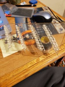 Currently, I am slightly behind schedule in terms of construction of the clock. I’m almost done with sorting the fiber optics by what number they correlate to. An image of the sorted fiber optics is included in the featured photo. This is by far the most time-consuming part of the construction process and is what has caused me to fall behind schedule. Once this is done all I need to do is join the fiber optics to LEDs using heat shrink, coat the front face of the clock with black epoxy and build the frame. The LEDs are housed in a sperate sheet of epoxy as shown below.