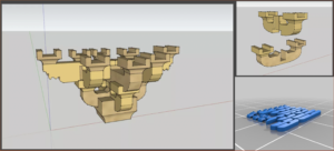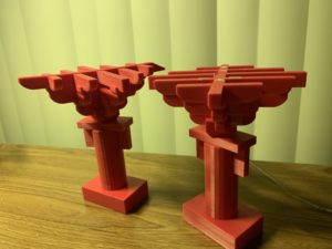 Sketup was implemented as the 3D design software. Beginning with small brackets, male and female parts are drawn along with supporting brackets. Then slide them into STL file. I tried two different procedure. One is printing out the top part as an integral and the other one is duplicating these small pairing brackets in the STL.Then assemble them manually just like what ancient architect did in China.
