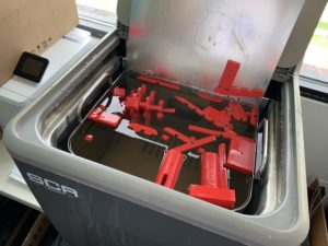 Here is the original parts I got from the printer. The black one is the supporting material created by the machine to make sure the rigid of the product. A special washing machine sitting besides the printer with a detergent did the landry work.