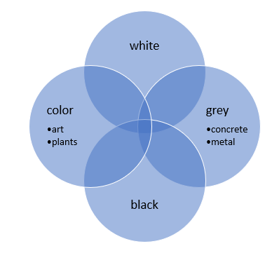 Finally, the last Venn diagram I think of for this aesthetic of is more related to modern architecture in homes and is about color/light. Lots of modern homes seem to be characterized by minimal but prominent furniture. Spaces tend to features lots of flat surfaces in kitchens and living rooms and very open floor plans. Furthermore, many modern homes seem to be almost assembled from multiple boxes made of different materials such as wood, concrete, and glass. Modern homes tend to use lots of light walls or white features and use materials such as wood or concrete as an accent.