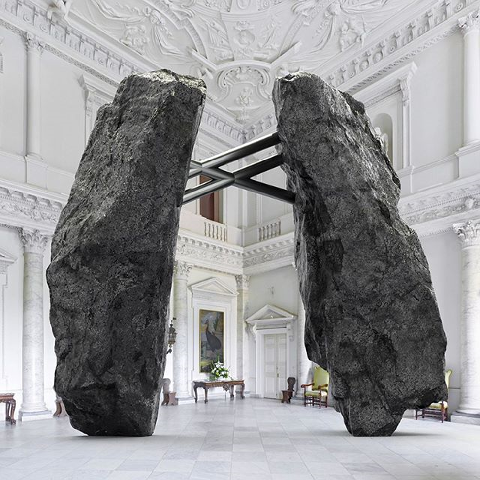 By contrast this piece merges metal and stone creating a stark visual difference between the rough natural texture of the rock and the cold, clean, smooth texture of the metal. By adding multiple materials together the artist is able to really make a visual impact.